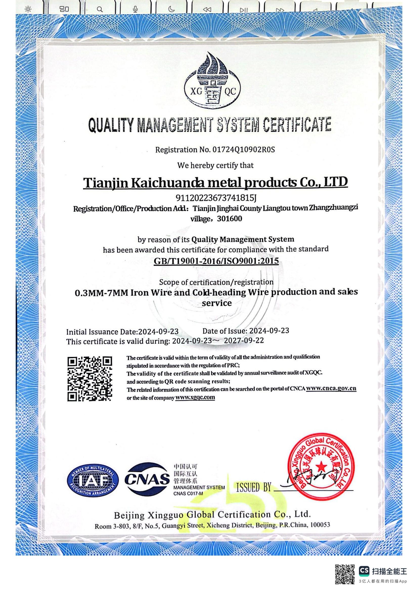 by reason of its Quality Management System has been awarded this certificate for compliance with the standard GB/T19001-2016/ISO9001:2015 scope of certification/registration 0.3MM-7MM Iron Wire and Cold Heading Wire production and sales service
