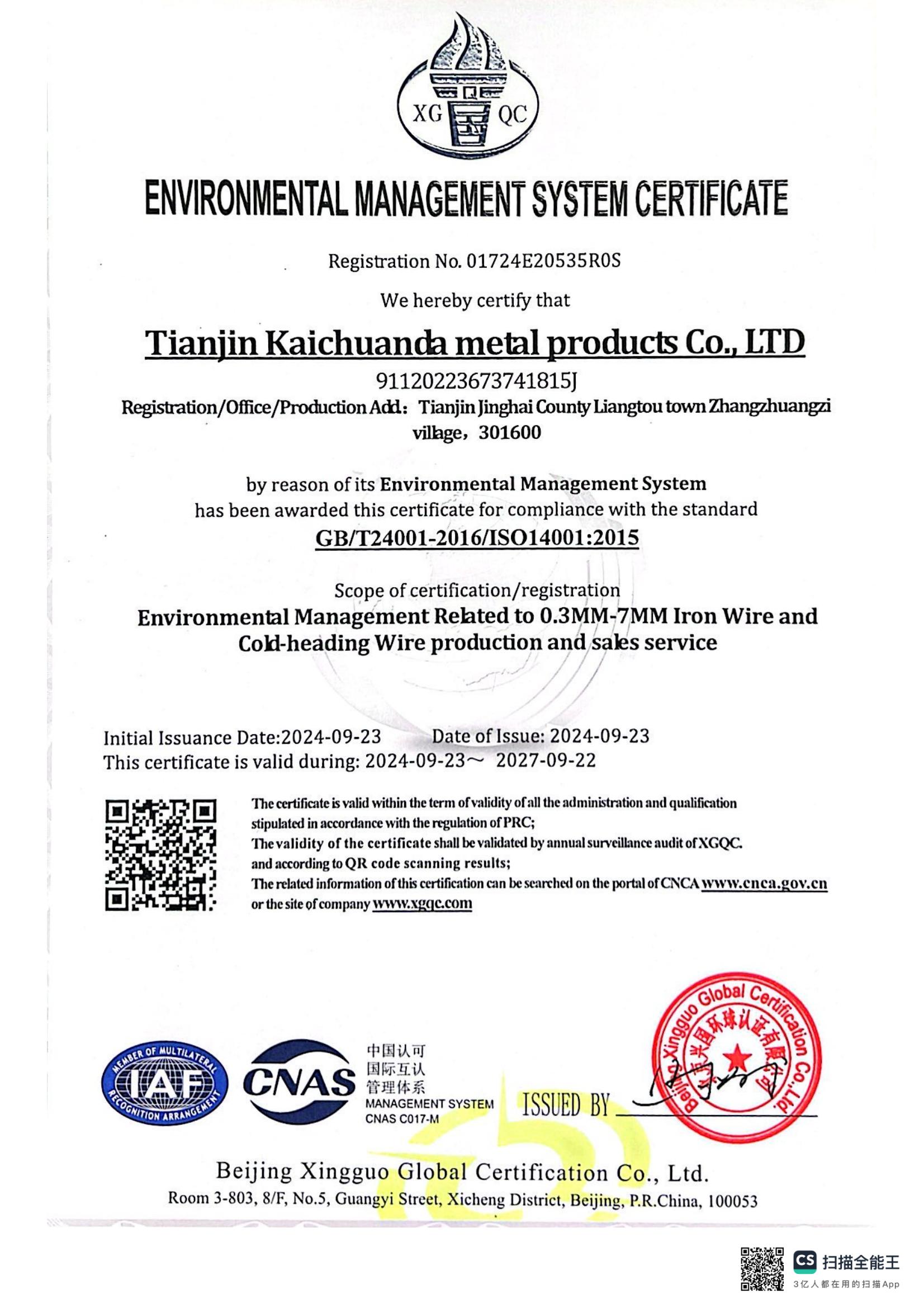 by reason of its Environmental Management System has been awarded this certificate for compliance with the standard GB/T2004-2016/ISO14001:2015 Scope of certification/registration Environmental Management Related to 0.3MM-7MM Iron Wire and Cold-heading Wire production and sales service.