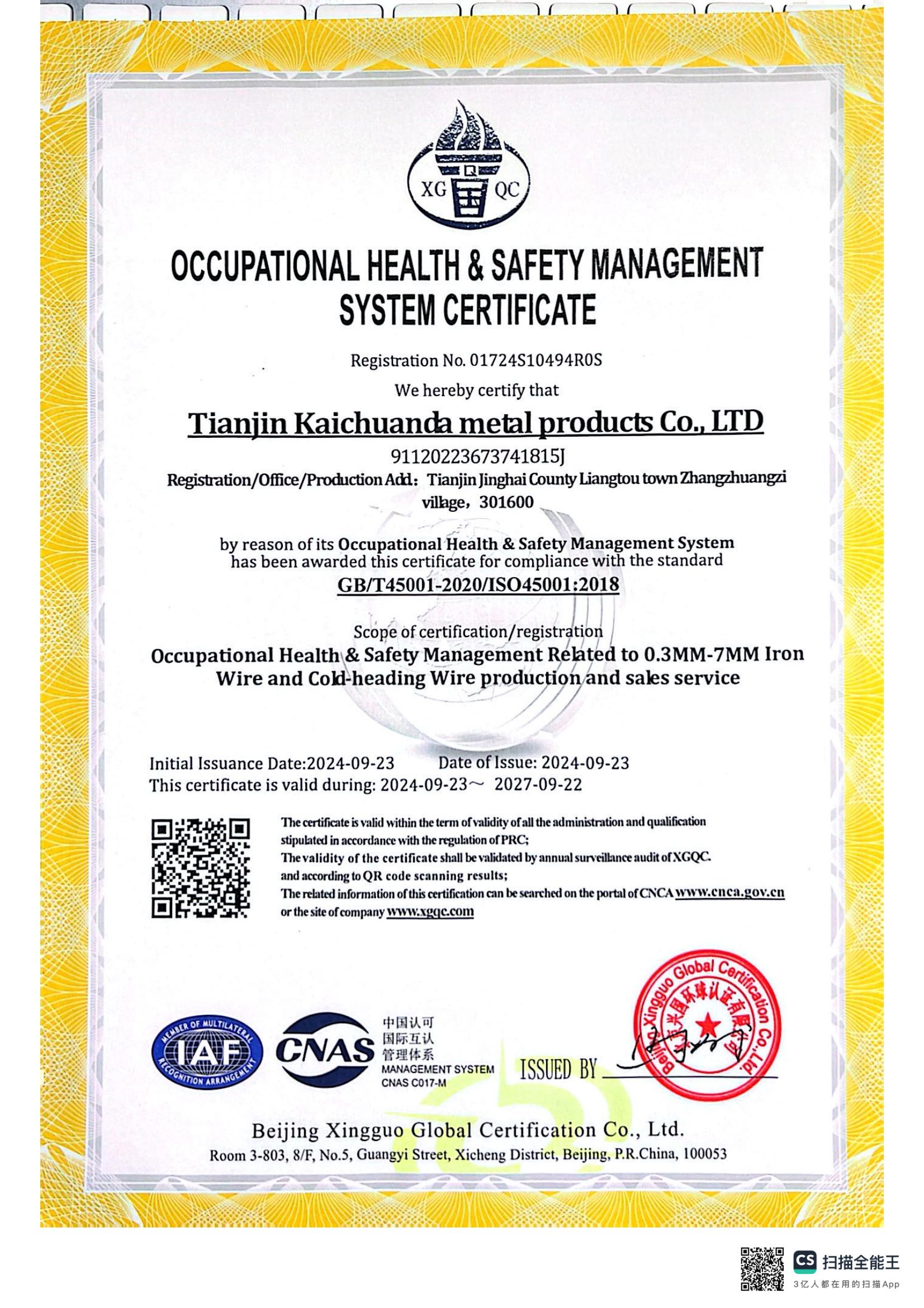 by the reason of its Occupational Health & Safety Management System has been awarded this certificate for compliance with the standard GB/T45001-2020/ISO45001:2018 Scope of certification /registration Occupational Health &Safety Management Related to 0.3MM-7.0MM Iron Wire and Cold Heading Wire production and sales servic